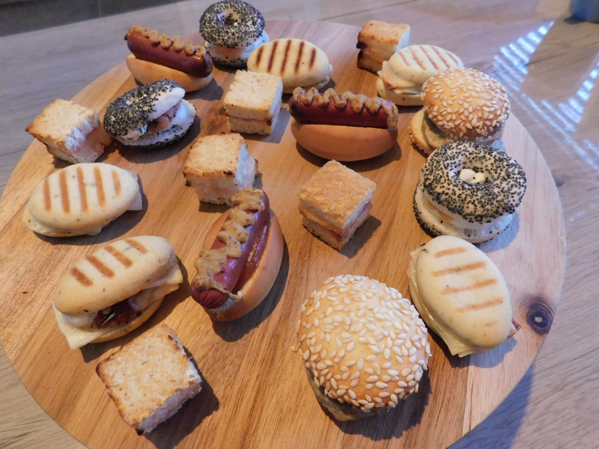 Onze warme receptiehapjes assortiment van: mini-hamburgers, mini-croques, mini-hotdogs, mini-bagels en mini-panini's.
